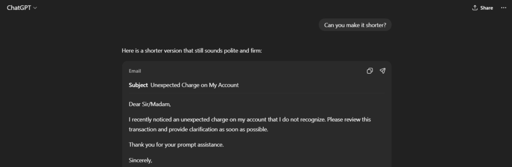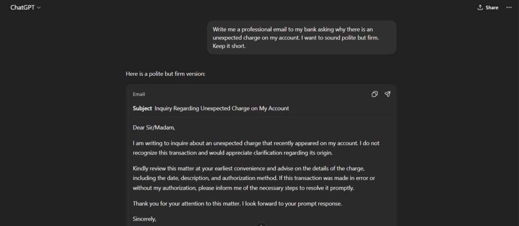 Be specific. Instead of saying “write me an email to my bank,” say “write me an email to Chase Bank asking why my account was charged $47 on March 15th.”